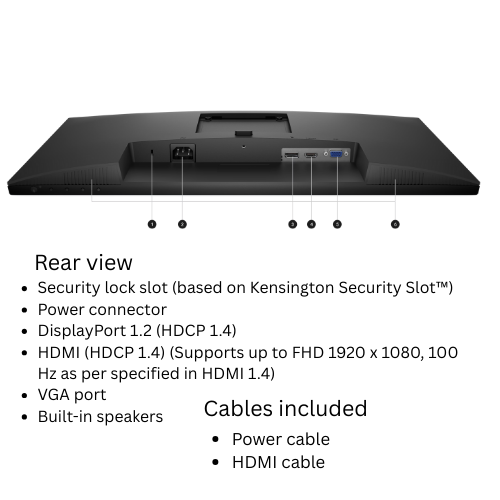 | Connectivity | Video port 1 HDMI port (HDCP 1.4) (Supports up to FHD 1920 x 1080 60 Hz as per specified in HDMI 1.4) 1 DisplayPort 1.2 (HDCP 1.4) port (Supports up to FHD 1920 x 1080 100 Hz ) 1 VGA port |