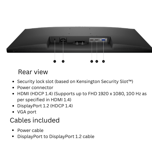 | Connectivity | Video port 1 HDMI port (HDCP 1.4) (Supports up to FHD 1920 x 1080, 100 Hz) 1 DisplayPort 1.2 port (HDCP 1.4) (Supports up to FHD 1920 x 1080, 100 Hz) 1 VGA port |