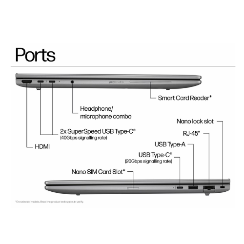 | Ports (Right Side) | 1 security lock slot; 1 RJ-45 Ethernet port; 1 USB Type-A 5Gbps signaling rate (powered); 1 USB Type-C® 20Gbps signaling rate (USB Power Delivery, DisplayPort™ 1.4) |